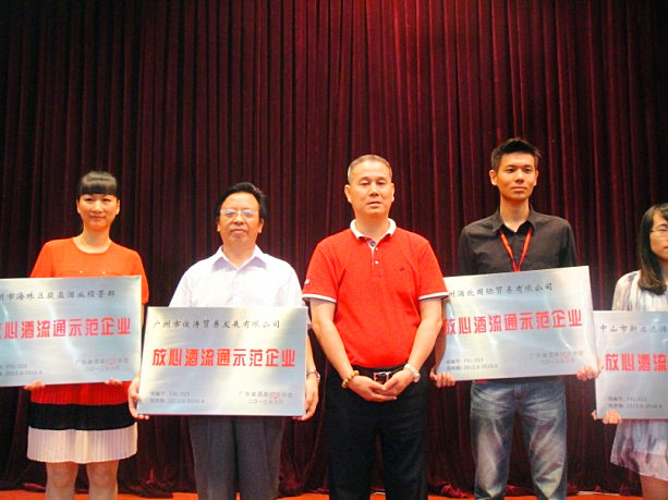 2013年06月28日,广东酒业大会暨省酒协第三届会员代表大会在琶洲国际会展中心举行。我司荣获广东省“放心酒流通示范企业”、2012年度广东酒业“优秀营销商”的光荣称号。省酒协会长朱思旭表示:希望我司可以继续坚持诚信经营、打造品牌这一理念,让更多的消费者可以喝上放心的酒,让广大消费者能够真正地得到更多的实惠!大会现场我司林副总(左二)代表公司领取“放心酒流通示范企业”牌匾我司林副总(左三)代表公司领取2012年度广东酒业“优秀营销商”牌匾