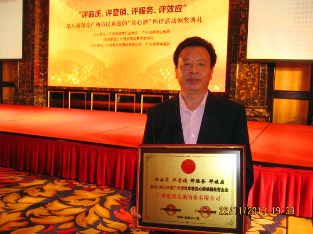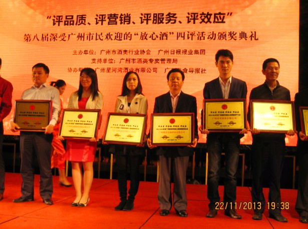 2013年11月22日,广州市酒类行业协会在星河湾大酒店举行了第八届深受广州市民欢迎的“放心酒”四评活动颁奖典礼。我司荣获2012-2013年度广州酒类市场放心酒诚信经营企业。我司在“评品质、评营销、评服务、评效应”四个评选指标中都获得了市酒协较高的评价。我司林副总表示,在国家发展的新时期里,公司会继续坚持诚信经营打造品牌的理念去发展公司,力争为酒类行业的发展作出更多的贡献!我司林副总(右三)代表公司领取荣誉牌匾