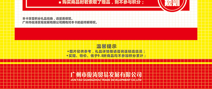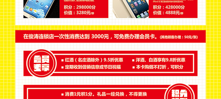 在俊涛连锁店一次性消费达到3000元,即可免费办理会员卡(其他顾客办理:50元/张)