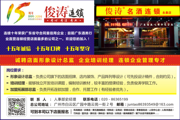 我司经过了十五年的发展,现今正在进一步地扩大业务当中,计划面向全国开展招商加盟业务和酒类企业培训策划咨询服务等,需要储备大量的贤德能人之才,我们真诚期待您的激情加入!以下是招聘信息内容:若有适合您施展才华能力的位置,请您赶紧拨打我司的招聘热线:020-86365199!