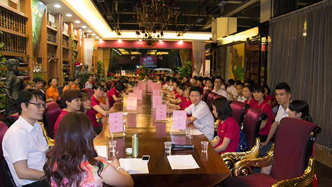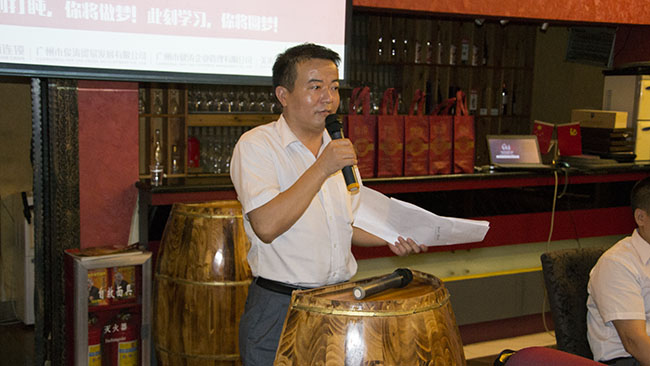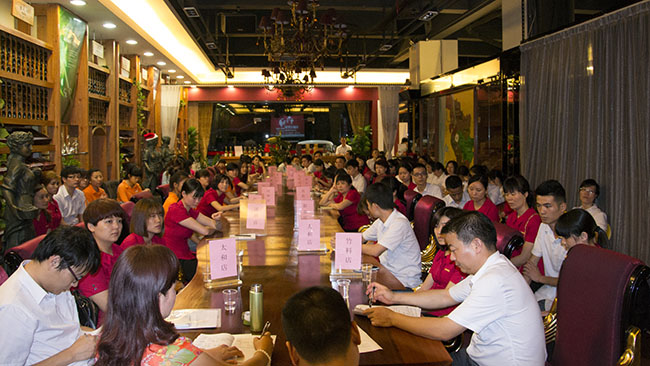 2015年05月27日,我司在永泰分店召开2015年五月份全体员工大会。大会上,刘建华副总经理主持了这场斗志昂扬,积极进取的员工大会。会上俊涛以及酒优多的各位店长做出对门店经营现状以及发展的长远规划,从美国归来的张总经理也为我们演讲了如何做一个优秀,积极,向上的俊涛人,并且还引进了哈佛图书馆的第一训言:“此时打盹,你将做梦;此时学习,你将圆梦!”,号召我们加强学习,提升自己。