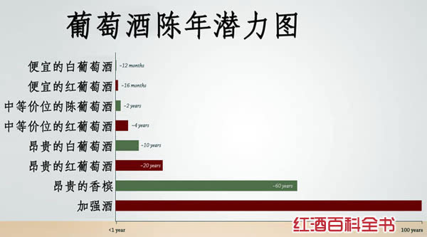 一般情况下,红葡萄酒的陈年潜力强于白葡萄酒,因为大部分的白葡萄酒和桃红葡萄酒都属于即饮型。不过也有例外,像勃艮第(Bourgogne)霞多丽(Chardonnay)、德国雷司令(Riesling)、奥地利绿维特利纳(Gruner Veltliner)、苏玳(Sauternes)甜白葡萄酒以及优秀年份香槟(Vintage Champagne)等,就拥有较好的陈年潜力,不过这只占其中的一小部分。