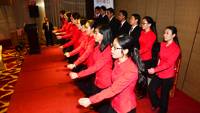 浓浓酒香中,一场气势昂然的操练表演拉开了此次会议的序幕,总办的同事随着刘副总的一声声令下,工整而流畅的完成了一套队列操练,向大家演绎了俊涛一直推崇的解放军精神。表演结束后,我司刘副总为本次活动开幕致词,回首过去,展望未来,刘副总为我们分享和总结了俊涛在2015年度所获得的成就与荣誉,也介绍了美涛及酒优多现今的发展情况,并宣读了公司2016年度的工作计划,为全体员工定下了全新的奋斗目标!