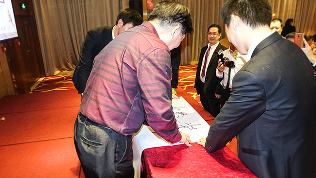 到场嘉宾也纷纷登台表示对俊涛的厚爱及期望,彭洪先生一番金言引人深思;黎虹女士与其先生一首《梅花引》震撼全场;何景辉会长的中华武术精妙绝伦;钟秉雄会长更是上台左右手挥毫,提笔写下对俊涛的鼓励与鞭策。这些嘉宾放下身架,展示自己的才艺与俊涛同乐,无不让全体人员热血沸腾。