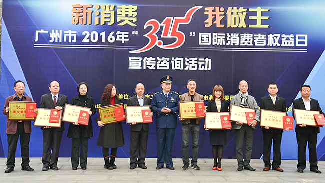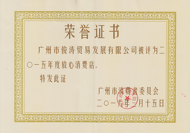 2016年3月15日,在由广州市工商局及广州市消委会联合举办的“3.15”国际消费者权益日宣传活动中,我司荣获“2015年度广州市放心消费店”称号!这是俊涛自2009年以来,连续七年蝉联此殊荣。