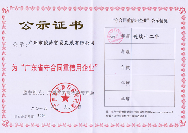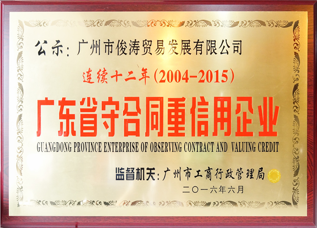 热烈庆祝我司连续十二年蝉联由广州工商行政管理局颁发的“广东省守合同重信用企业”荣誉称号,感谢政府、消费者及广大同仁对我司的支持和厚爱!