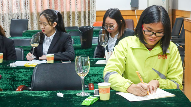 观察酒色,握住杯脚,酒杯需透明乾淨。以明亮或白色背景为底,以酒的颜色观察质感。