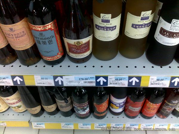 此外,记者在对这片葡萄酒专区的调查中还发现了一些不够妥当的现象,比如说,时常在一排售价仅为十几元/瓶的产品中,“惊现”一瓶售价达100多元的产品;价位在十几元的产品被高高地放置在排面的最顶端,而售价达四五百元的产品却被塞到排面最底层一个不起眼的角落,产品排面混乱可见一斑。希望这只是个别商超里的个别现象。