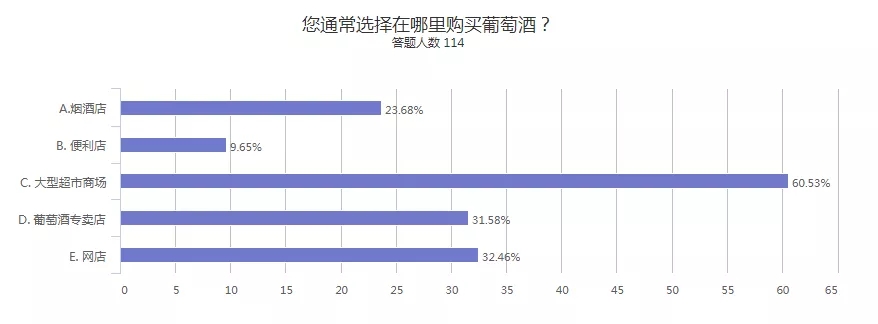 消费葡萄酒场合中有63%在家里,47%左右在餐饮,娱乐场所占了26%。家庭消费葡萄酒的比例大的主要原因在于,人们的生活水平提高,保健意识增强,追求时尚的消费理念正在逐步形成;夜场消费主要是啤酒和洋酒,葡萄酒目前受价格和消费习惯的影响,在夜场还只能是配角;此外,对于目前的年轻消费者来说,还没有养成去葡萄酒酒窖喝酒的习惯。