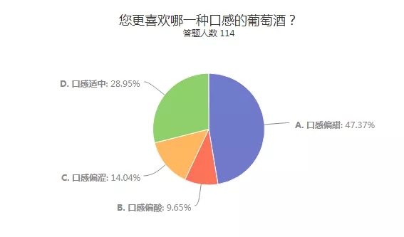 口感偏甜的葡萄酒受到近半数人的喜爱,占比为47.37%,其次为口感适中的,占比为28.95%。而从交叉结果显示,女性对甜型葡萄酒的爱好程度要远高于男性。由于受生活环境和口味习惯的影响,偏酸偏涩的葡萄酒并不受年轻消费者的喜爱。