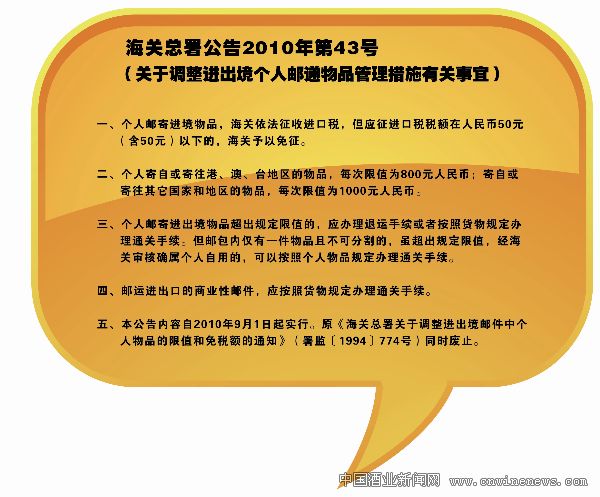 9月1日,海关总署《关于调整进出境个人邮递物品管理措施有关事宜》正式开始实施。自此,海关对个人邮寄物品免征进口税的额度,从500元降低至50元,对邮递进境物品应缴进口税超过50元人民币的一律按商品价值全额征税。根据新规定,酒类文章来源华夏酒报物品进口税的具体税率为50%。