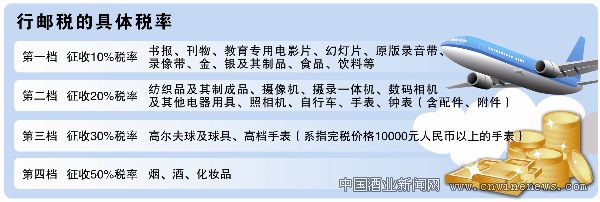 根据新规定,酒类物品邮税的具体税率为50%,按照50元免税额的征收标准,也就是说物品价值超过100元人民币(约折合14.7美元)的进口酒就必须征税,而此前按照500元的标准是物品价值超过1000元人民币起征,折合美元约147美元。