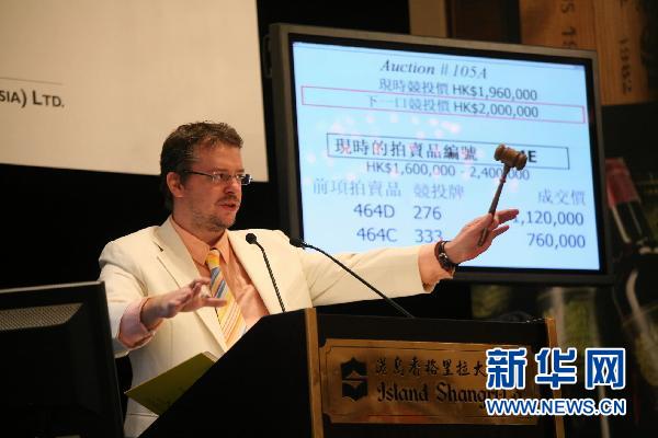 本次拍卖全场成交价最高价达231.8万港元的囊括1990至2001年全部12个年份的12瓶装箱DRC罗曼尼康帝组合(11月5日摄)。 11月5至6日,Acker Merrall & Condit名酒拍卖行在香港举行名酒拍卖会,推出了1300批顶级珍酿,两天拍卖共创下高达9550万港元总成交额,拍品成交率达98.7%。