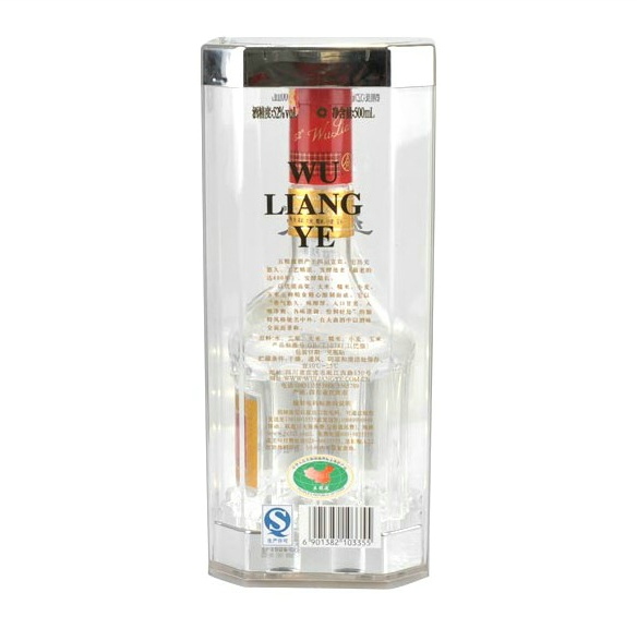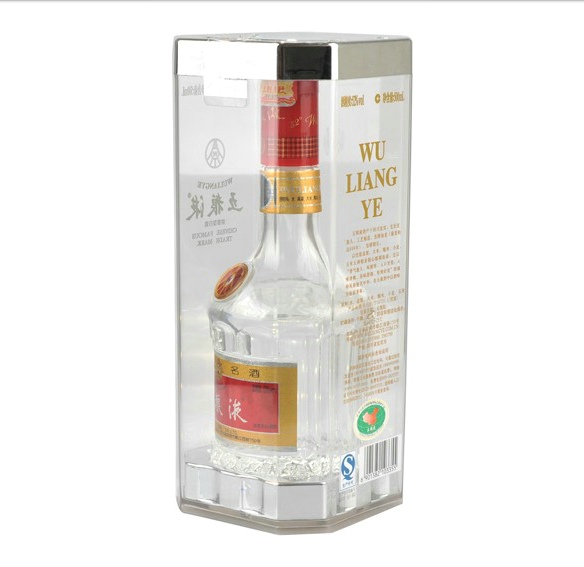 全新包装的五粮液采用呈八面型的全透明的环保材料PET聚酯盒,盒口是一个一次性拉断防伪封盖。透过聚酯盒,能清晰地看到盒内的五粮液酒瓶及五粮液酒。酒瓶的商标和颈标是采用意大利“金膏烧印”技术烧印而成,与瓶身融为一体;厂徽标记是运用德国的“模内转移”新技术,比传统做法更闪亮,更富立体感;瓶盖则是引进美国先进的“3M回归反射”高隐秘防伪技术。新包装由外到内的三重防伪技术使中国名酒五粮液的防伪水平达到了国际最新水准,再加上内外透明包装形成的强烈立体感,使五粮液比过去更显豪华和精美