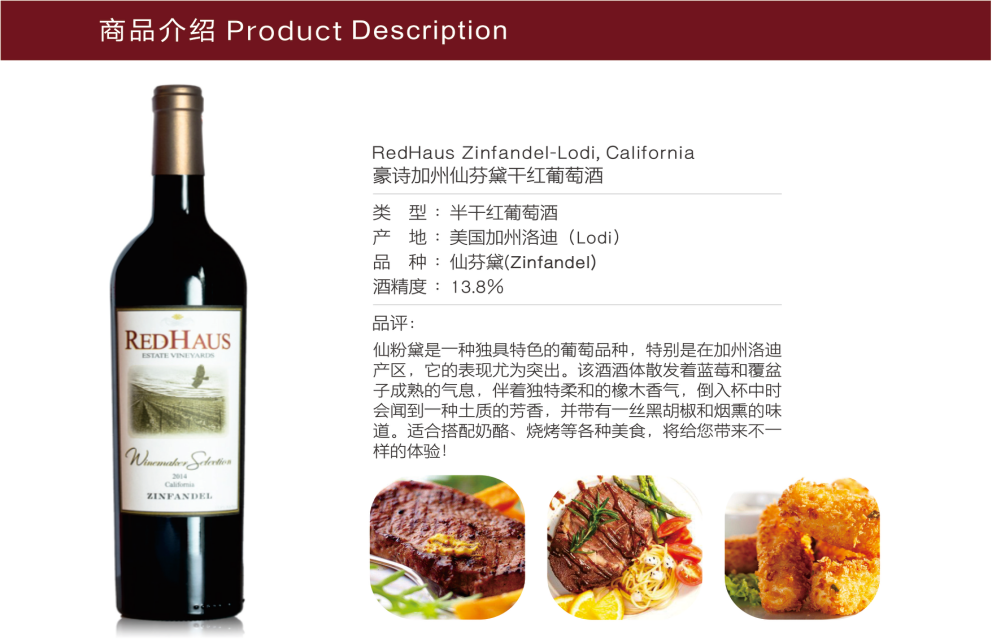 【类型】:半干红葡萄酒【品种】:仙芬黛(Zinfandel)【产区】:美国加州洛迪(Lodi)【酒精】:13.8%【搭配】:肉类、芝士、鹅肝【品评】:这款由美国橡木桶酿造的葡萄酒,蓝莓和覆盆子成熟的口感特征伴着独特柔和的香味,倒入杯中时会闻到一种土质的芳香,并带有一丝白胡椒和烟熏香。豪诗仙芬黛酒体轻柔,适合搭配奶酪、烧烤等各种美食,打破常规食物搭配规则,将给您带来不一样的体验!